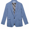 ז'קט מבד פשתן, תכלת כהה, בגזרה ישרה אם כפתור אחד , בטנת ז'קט מודפסת.