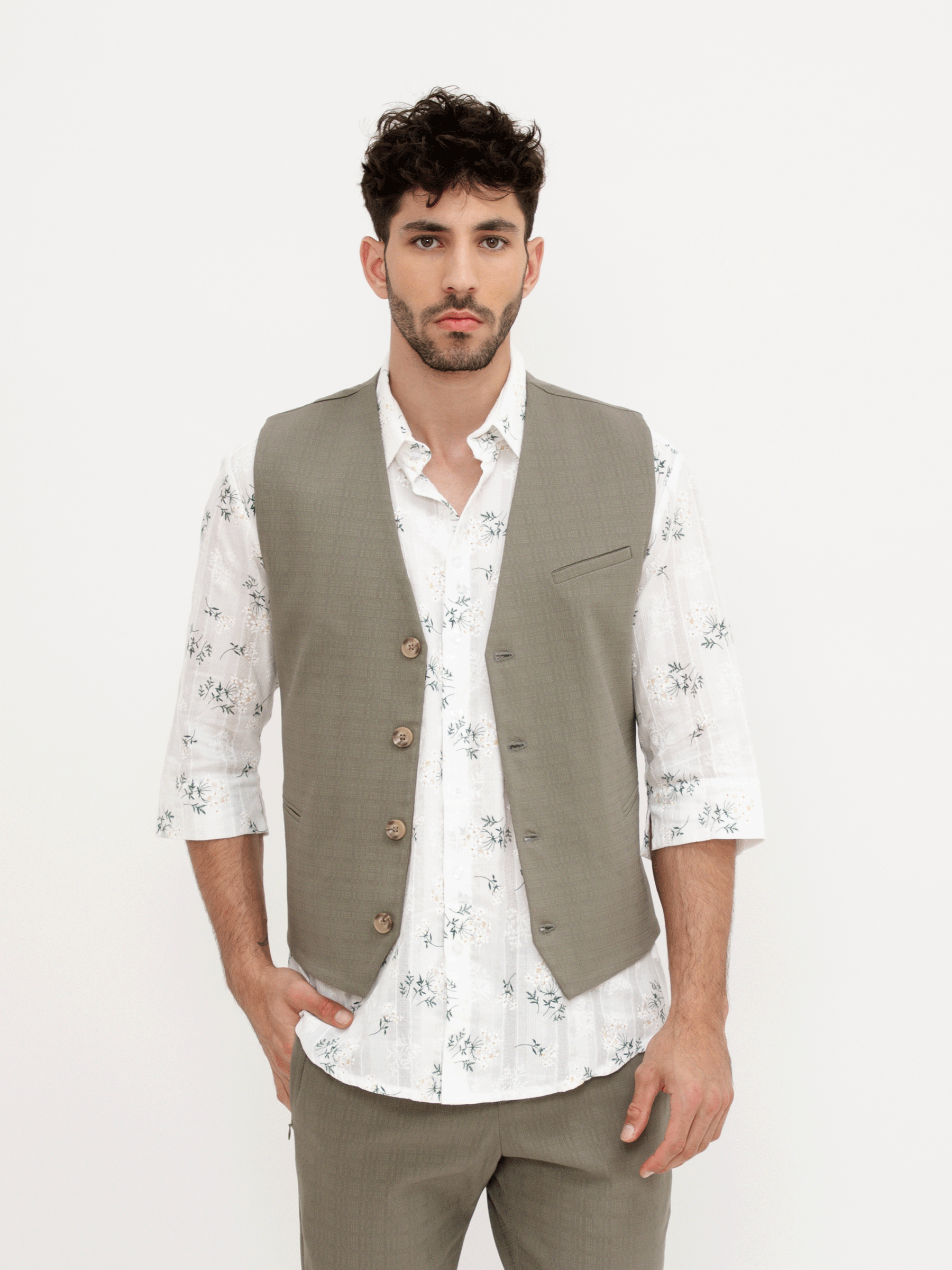 חולצה מכופתרת עם טקסטורת פרחים בגזרה קרובה לגוף, שרוולי ד.א אייקונים באורך המרפק, צווארון קלאסי, סגירת כפתורים.