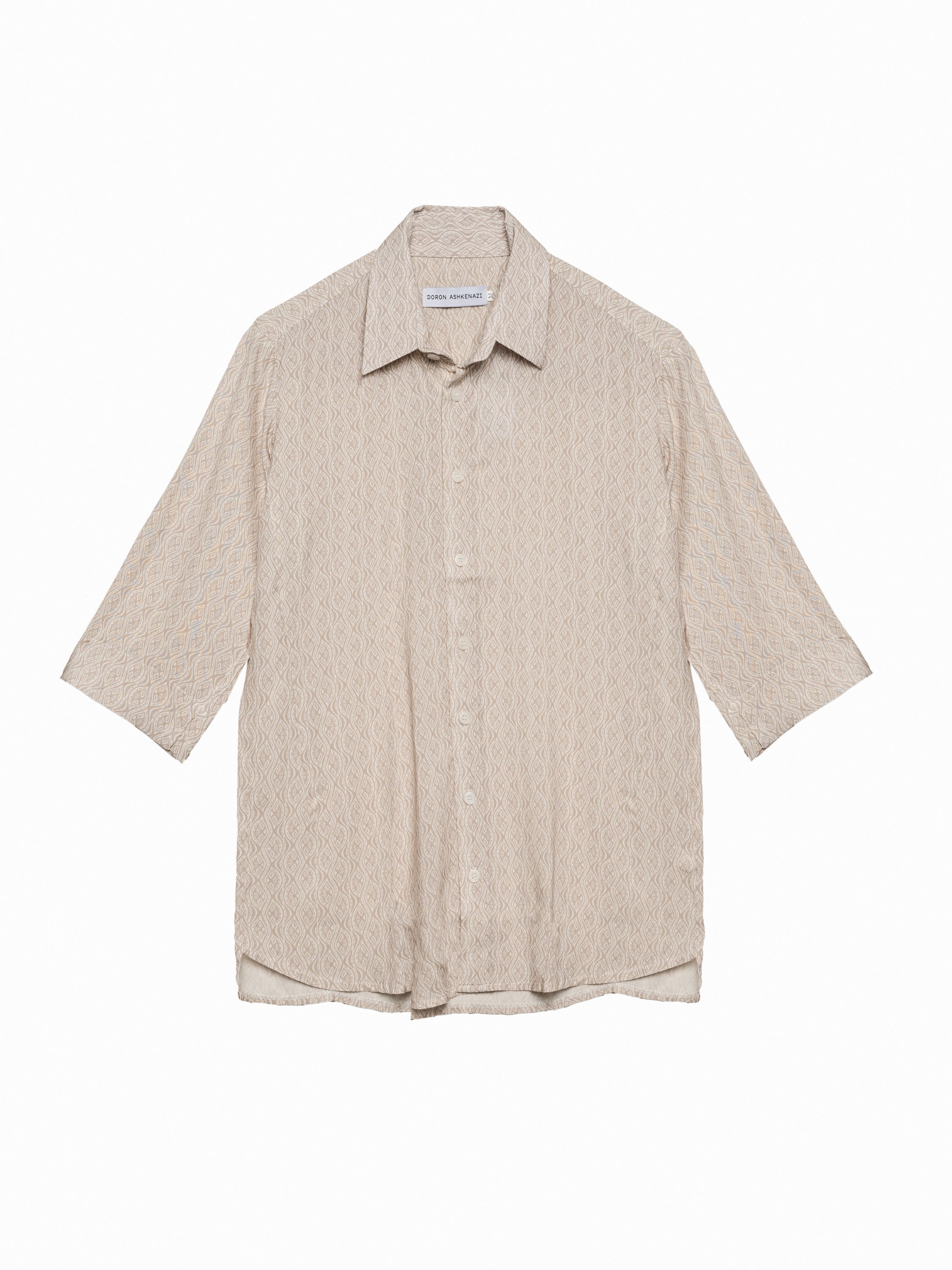 חולצה מכופתרת בצבע אבן עם הדפס אבסטרקטי, בגזרה קרובה לגוף, שרוולי ד.א אייקונים באורך המרפק, צווארון קלאסי, סגירת כפתורים.