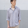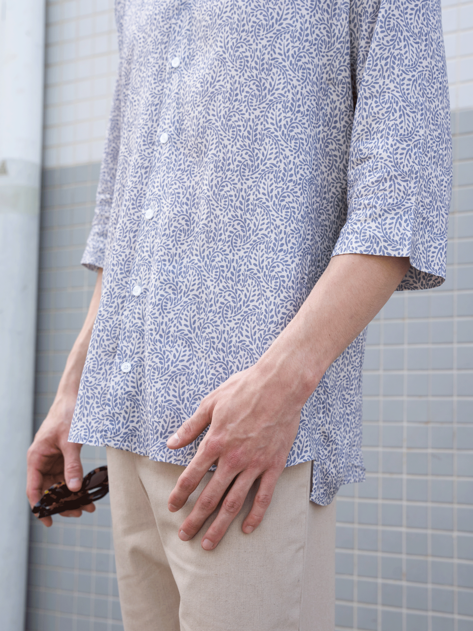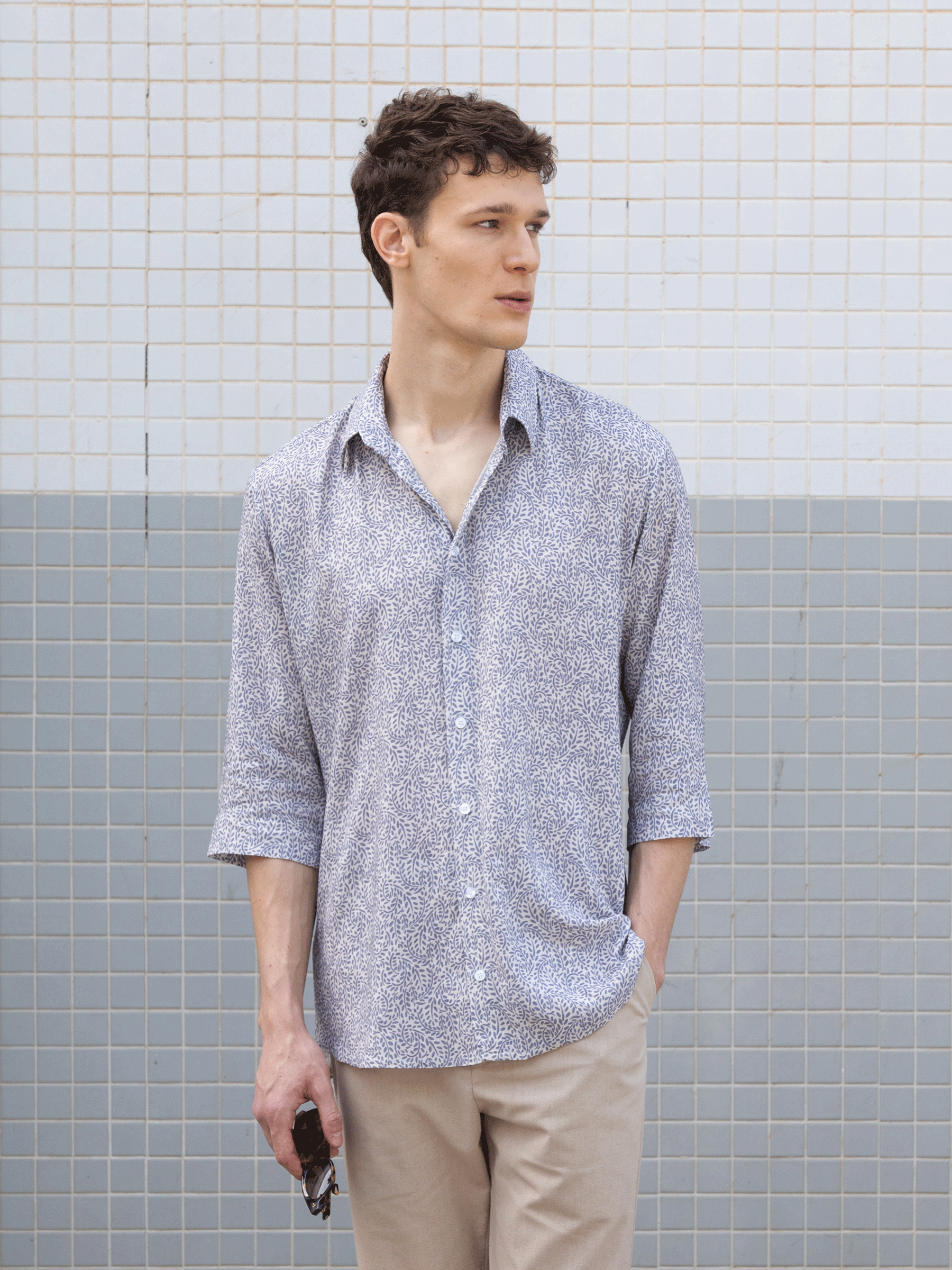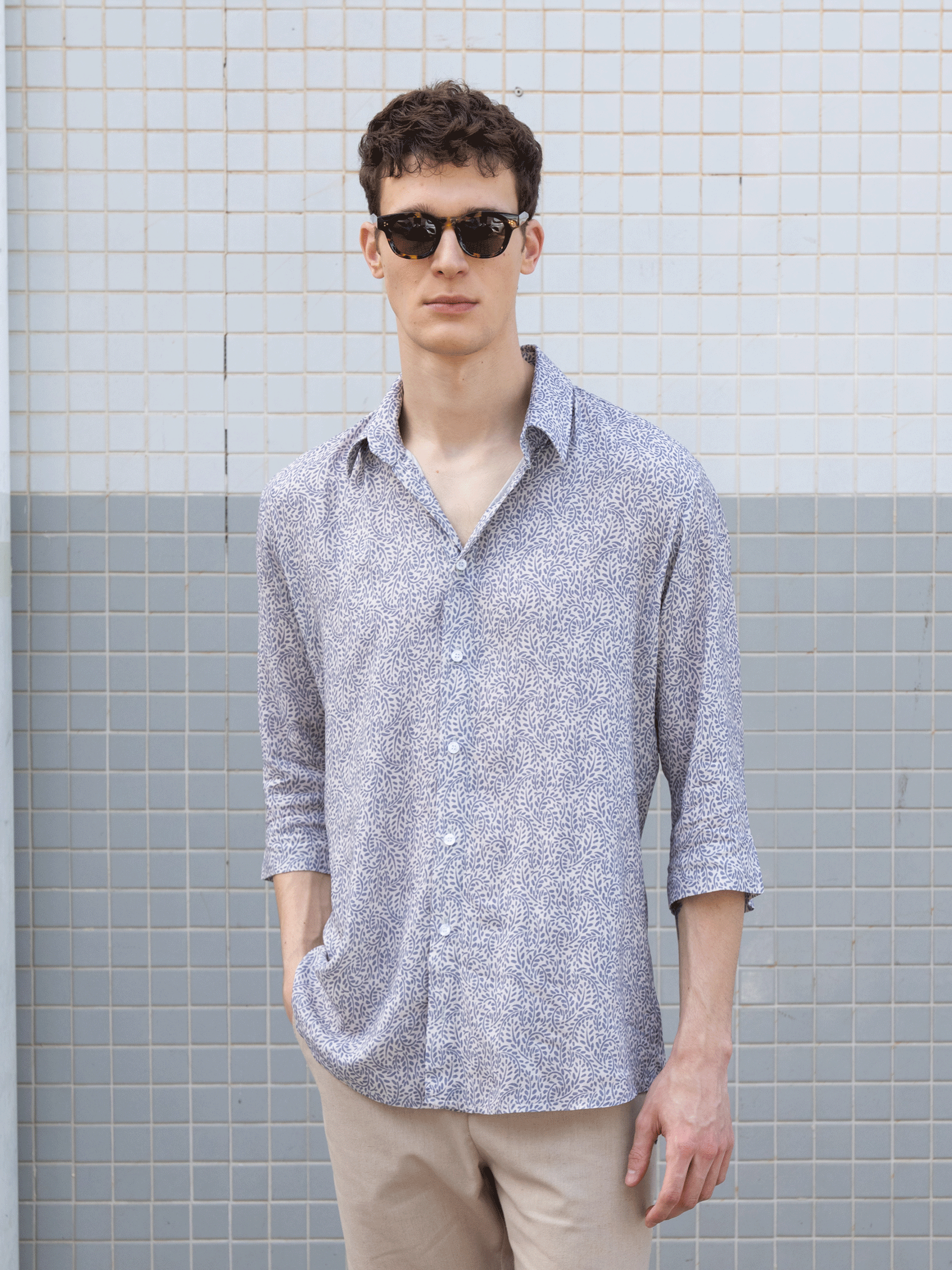 חולצה מכופתרת בצבע שמנת עם הדפס בהיר של מוטיב עלים אבסטרקטי בכחול , בגזרה קרובה לגוף, שרוולי ד.א אייקונים באורך המרפק, צווארון קלאסי, סגירת כפתורים.