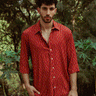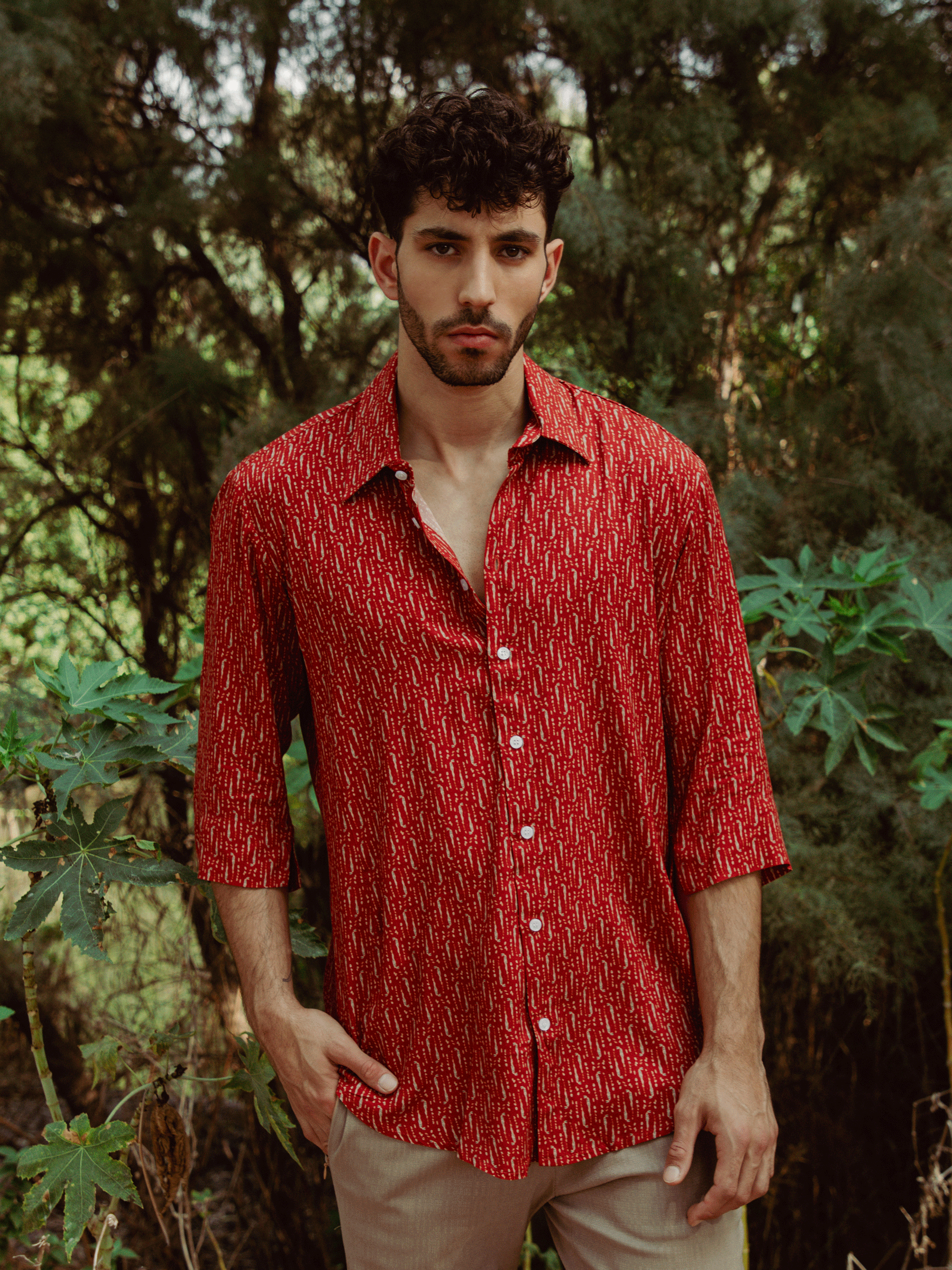 חולצה מכופתרת בצבע אדום בריק עם הדפס קטן בצבעי אבן ואפור בגזרה קרובה לגוף, שרוולי ד.א אייקונים באורך המרפק, צווארון קלאסי, סגירת כפתורים.